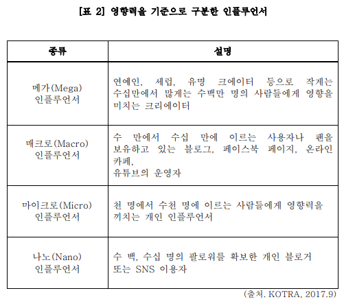 [표 2]에서 보듯이 메가(Mega) 인플루언서, 매크로(Macro) 인플루언서, 마이크로(Micro) 인플루언서, 그리고 나노(Nano) 인플루언서 의 4 가지 유형으로 구분하는 방식이 있는데, 이는 인플루언서의 활동과 역할이 마케팅에 영향을 미치기 때문에 마케팅의 비용과 효율의 측면의 기준이 강조된 분류방식이다.